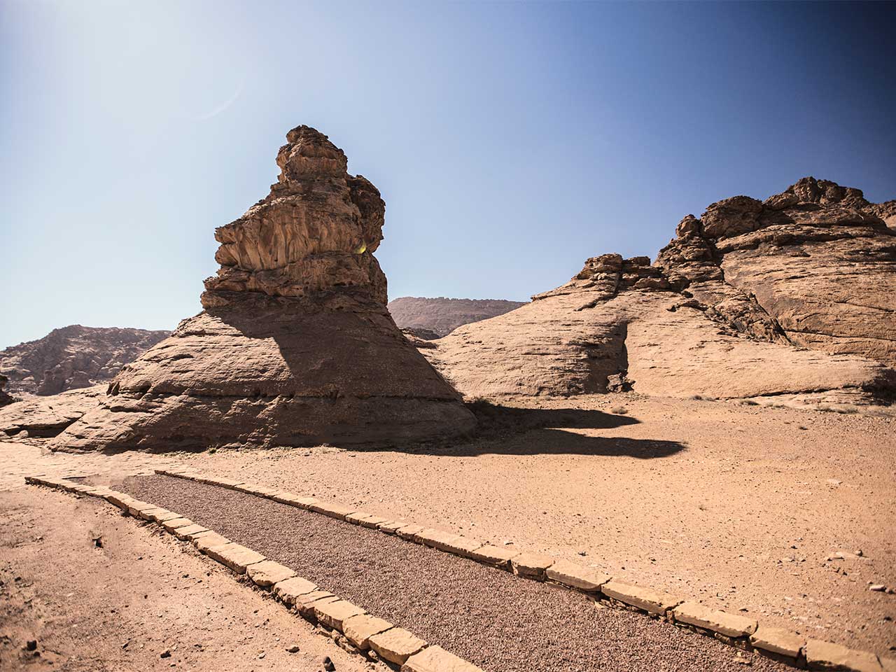 Vous atteindrez les environs de AlUla en fin de journée. La découverte de la sculpture naturelle la plus connue du site, Jabal Al-Fil, vous donnera un bel avant-goût de ce qui vous attend le lendemain. Ce grand rocher en forme d’éléphant est un lieu emblématique à AlUla.
