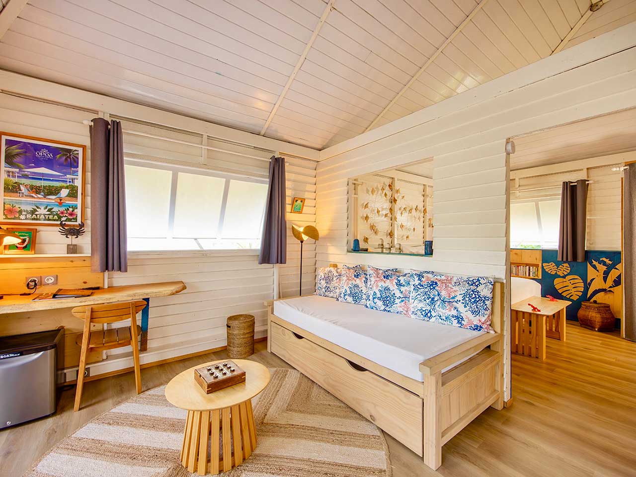 Cet établissement à taille humaine se distingue par une décoration soignée, avec des matériaux naturels et des couleurs claires. Bien équipé, moderne, il s’intègre dans un jardin fleuri et exotique : arbres fruitiers, bougainvilliers, oiseaux de paradis, hibiscus ou encore fleurs de tiaré… Entre repas savoureux, détente au bord du lagon, massages et excursions sur Raiatea ou Taha’a, vous profiterez de moments hors du temps dans cet établissement chaleureux.