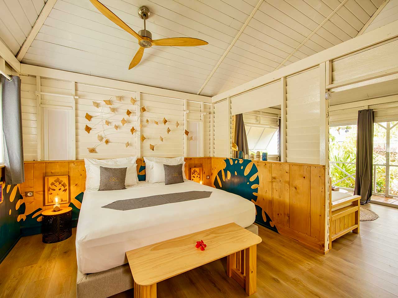 Chaque bungalow est décoré dans un style tropical, clair et épuré, avec du mobilier en bois, notamment du teck cérusé blanc. Des matériaux locaux contribuent au charme, comme des fibres de cocotier et des racines de miki-miki pour les luminaires.
