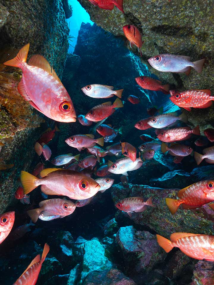 À Sainte-Hélène, la nature est généreuse pour les snorkeleurs, les plongeurs et les apnéistes. En saison, vous pouvez assister à la migration des baleines à bosse ou à l’agrégation de familles de requins-baleines. Trois espèces de dauphins sont résidents et ce sont parfois des milliers d’individus que l’on aperçoit depuis la surface. En plongée, la faune est abondante et variée, à l’abri des reliefs volcaniques.
