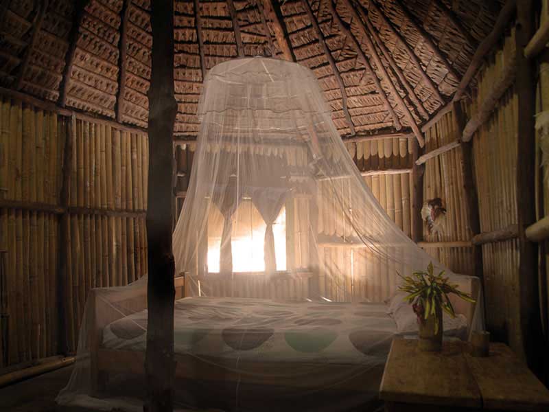 Chaque bungalow est équipé d’un lit double et d’un lit simple, d’une moustiquaire, ainsi que de toilettes, et d’une douche avec eau à température ambiante. Vous bénéficiez de l’électricité 24h/24.